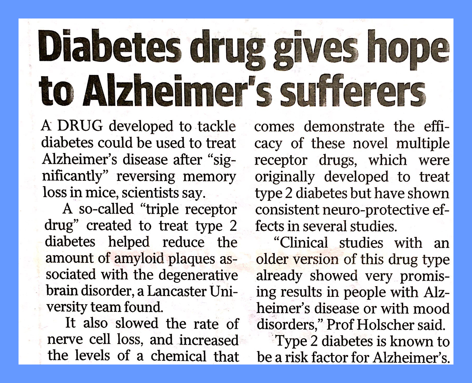 Diabetes drug gives hope for Alzheimer’s sufferers